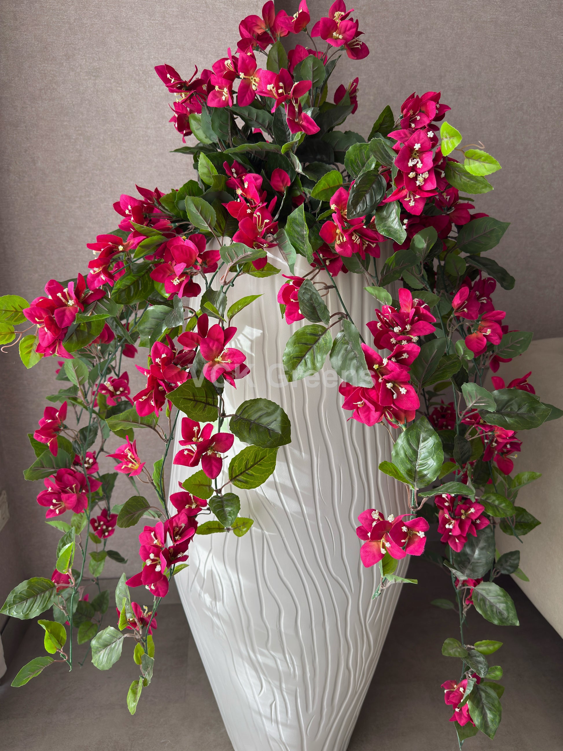 Bring the beauty of the outdoors to your indoor spaces with our lifelike Artificial Bougainvillea Flowers. These 4.6ft tall flowers come in a tall white fiber pot, adding a touch of elegance to any room. Perfect for home or office decor, events, and more.