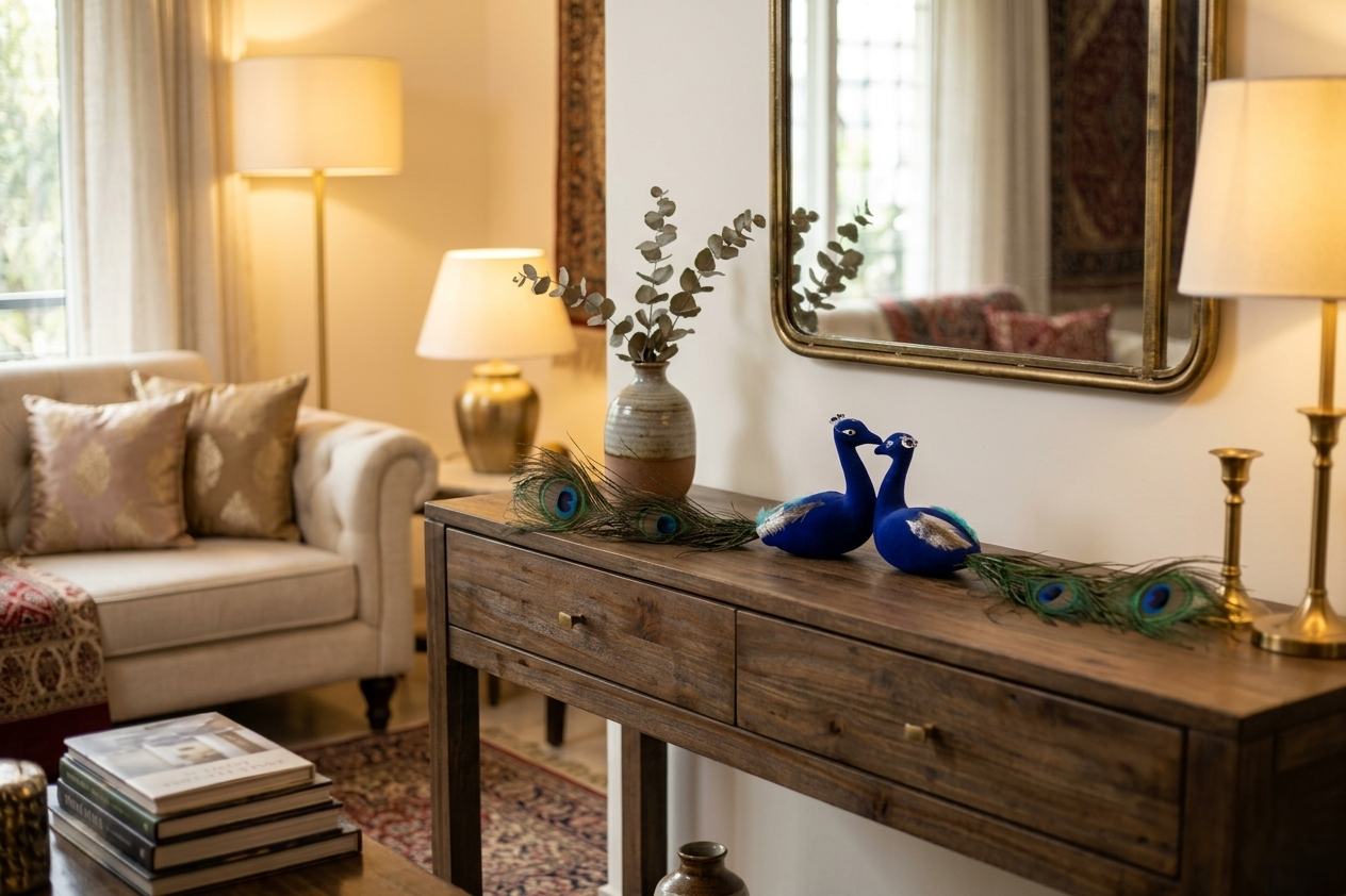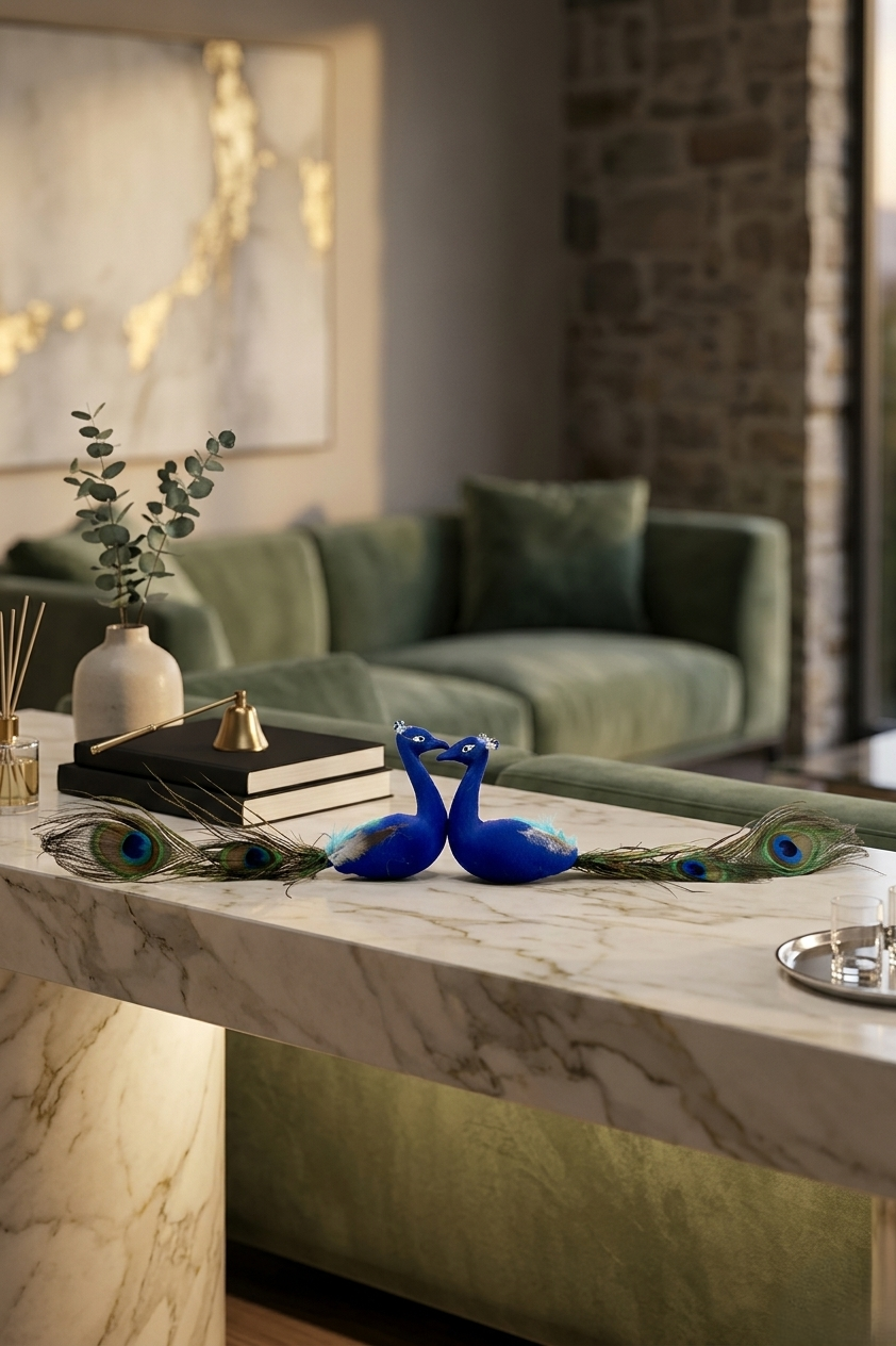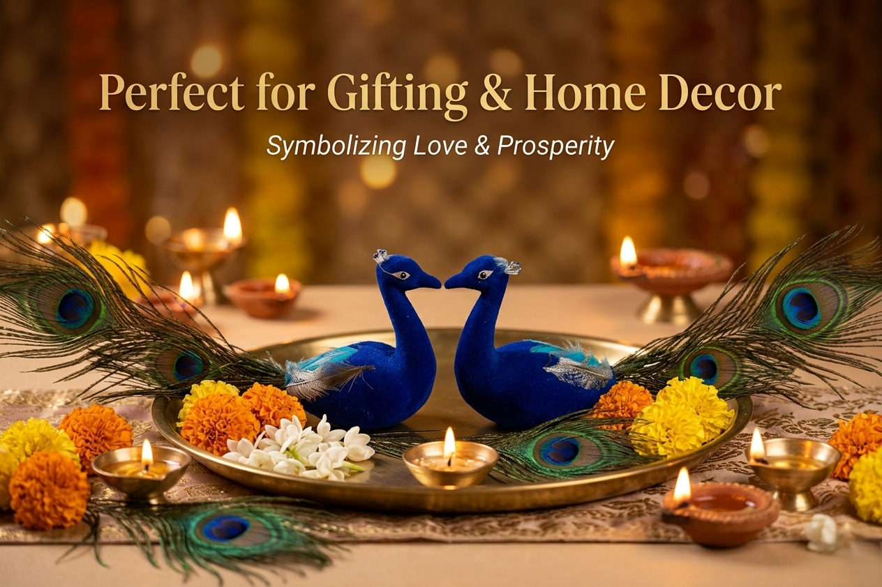 Bring charm and elegance to your space with this beautifully crafted decorative blue peacock pair, designed with long natural-style feather tails for a rich and graceful look. This eye-catching piece is perfect for home dรฉcor, festive decoration, return gifts, trousseau packing, hamper decoration, and display styling. Its vibrant color and attractive design make it a lovely addition to tables, shelves, pooja dรฉcor setups, and gifting arrangements. Ideal for adding a decorative and artistic touch to any setting.
