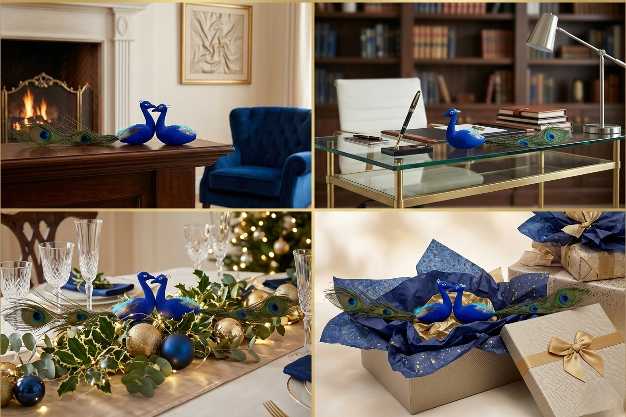 Decorative Blue Peacock Pair with Natural Feather Tail