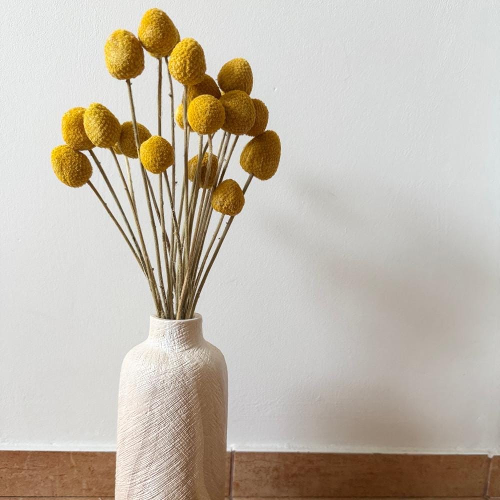 Dried Craspedia Bunch contains 20 stems that are carefully dried and preserved to maintain their delicate blooms and warm beige color. Perfect for use in vases, wedding arrangements, bouquets, and home dΓ©cor, these stems provide a long-lasting, maintenance-free solution that adds natural texture and subtle elegance to any setting.